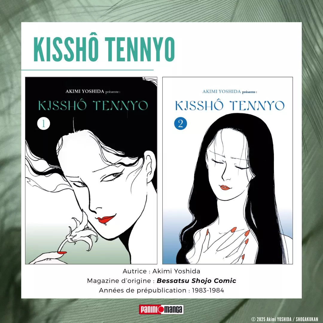 Enfin, le dernier titre de mon top a été un peu moins évident, car j’avais plusieurs œuvres en tête. Mais finalement, c’est la série en 2 tomes Kisshô Tennyo de Akimi Yoshida dont je souhaite vous parler. Grâce aux éditions Panini, l’autrice revient en France, avec plusieurs de ses titres et cela fait plaisir. Personnellement, je connaissais l’autrice pour sa série Kamakura Diary aux éditions Kana et je n’avais pas pu découvrir Banana Fish, jusqu’à ce que Panini sorte la nouvelle édition en grand format. Depuis, nous avons eu droit, dans le même format, à la série en 6 tomes Yasha, aux one-shots La Cerisaie et Lovers’ Kiss, à la série en 3 tomes Le Sommeil d’Eve, et enfin la série en 2 tomes Kisshô Tennyo. Cette dernière a eu une édition en coffret contenant un ex-libris et c’est cette version que je me suis procurée.